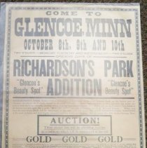 Full page advertisement for Richardson's Park Addition auction at Glencoe, Minn. on Monday, Tuesday, Wednesday, October 8, 9, 10, [1928?]. Choice lots in "Glencoe's Beauty Spot" were offered at Auction. $5 & $10 gold pieces, Lowney's High Grade Chocolate Bon-Bons candy for the ladies, and $150 grand prize were enticements to attend. Massey & Peale, Robbinsdale, Minn., Sales Managers. Advertisement printed by Glencoe Enterprise Print, Glencoe M...
