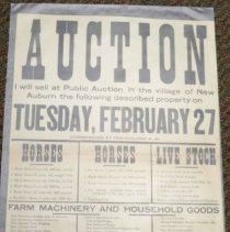 Full page advertisement for an Auction on Tuesday, February 27, 1917 in New Auburn for farm property belonging to H. J. Beebe. R. H. Funk, Auctioneer; A. A. Hubbard, Clerk. The auction included eleven horses, livestock, farm machinery and household goods. Advertisement printed by Glencoe Enterprise Print, Glencoe MN.