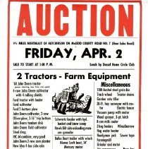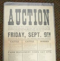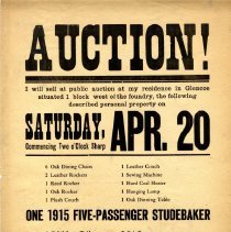 Auction poster for household furniture & a 1915 Studebaker owned by Mrs. R. Cunningham.held April 20,[1918] at her Glencoe residence 1 block west of the foundry. F.X. Kohler, Auctioneer; A. M. O'Donnell, Clerk. Terms: Cash or due November 1, 1918. Poster printed by Glencoe Enterprise Printing.