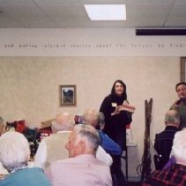 Color photograph from the McLeod County Historical Society Christmas party fundraiser & auction, December, 2006. Lori Pickell-Stangel and Jim Fahey are pictured in front of the crowd during the auction.