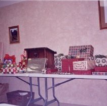 Color photograph of the display of auction items for the 2007 McLeod County Historical Society Christmas auction and party.