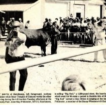 Scanned photograph of a 4-H Auction at the McLeod County Fair conducted by (left) Gerrit Smith, Hutchinson and (right) Omer Templin, Glencoe. "Big Red", a blue ribbon 1250 pound steer raised by Anne May Pohlmeier, sold to Rockite Silo of Hutchinson. Undated.