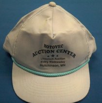 Promotional novelty cap from Hotovec Auction Center, Hutchinson, MN. "Livestock auction. every Wednesday." Light blue cloth with navy lettering and blue cord across bill.