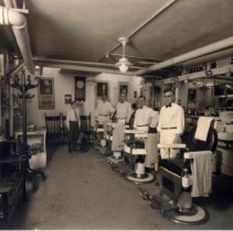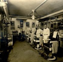Sepia toned reproduction photograph of employees at Chris Peterson's Barber Shop located in the basement of the Hotel Jorgenson, Hutchinson. Identities: (l to r) Henry Bohn's son (shoeshine boy), Fred Bohn, Henry Bohn, ____Reynolds, Chris Peterson. Taken c. 1923. Note the fancy coat rack and the A. A. Fallon calendar turned to March. Reproduction photograph of original 2008-0163-001 prepared for display purposes.