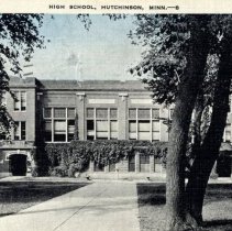 Tinted picture postcard of Merrill High School, Hutchinson, MN. Addressed to Mrs. G. Peterson, St. Paul. Message about sleeping arrangements and about train travel on the Great Northern. From, Margie. Postmarked Hutchinson, MN, April 21, 1944. A Liberty One cent stamp. The brick H.L. Merrill School, located in North Park facing Second Avenue Southwest, was built to accommodate up to 300 high school students. Its first class graduated in ...