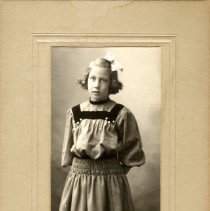 Sepia toned studio photograph of a girl identified as Agnes Peterson. She is wearing a dress with a knee length skirt, pleated waist and puff sleeves. She has a ribbon in her hair. The photo is credited to Peterson, Hutchinson, MN and is mounted on photo board.