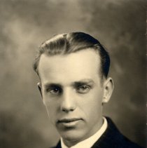 Sepia toned studio photograph of Etler Peterson wearing a dark suit with polka-dot tie. This photo is his 1925 graduation picture from Hutchinson High School. The photo is credited to Carter's Studio, Hutchinson.