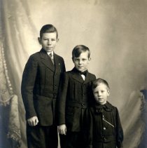 Sepia toned studio photograph of (l to r) Arthur, Etler, & Oswald Peterson - all wearing short pant suits with dark ties