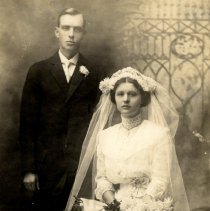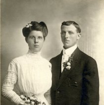 Black & white studio wedding photograph of Arthur Jens Jensen and Maggie Alice Ann Peterson. The couple was married November 3, 1911 in Brownton. Arthur was the son of Peder B. and Ana Marie Thompson and was the manager of the Midland Lumber Co. yard at Brownton. Maggie was the daughter of Mr. & Mrs. Fritz Peterson. Arthur was a cousin to the donor's mother Mabel Laugeson Ewald and a brother of Bertha Jensen Zimmerman (Mrs. Otto). Photo is c...