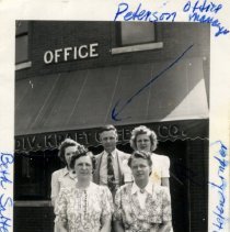 Black & white photograph of five people standing in front of Kraft Foods, Hutchinson MN, c.1942-43. (l to r) Back row: Beth Satterlee, Peterson (office manager), Helen Linder. Front: Emily Ames, Helga Nielsen. The women are wearing summer dresses.