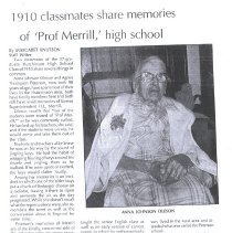 Scanned newspaper clipping from the May 31, 1990 Hutchinson Leader. Hutchinson Class of 1910 classmates Anna Johnson Oleson & Agnes Thompson Peterson shared memories of Hutchinson High School, Professor Merrill, and their early employment and marriage. Includes a composite photo of the Class of 1910.
