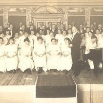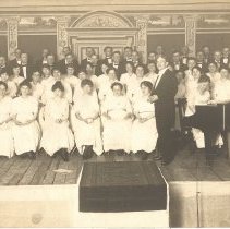 Sepia toned photograph of the Hutchinson Community Chorus on a stage with wood floor boards, early in the twentieth century. Men dressed in dark colored tuxedos and bow tied shirts, women in light colored dresses. A sheet music stand is near center stage. Photo mounted on light weight photo board. Taped to the back (in 3 corners) is a yellow colored paper with type written names identifying a few of the chorus members. Among the members wer...