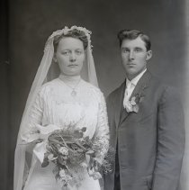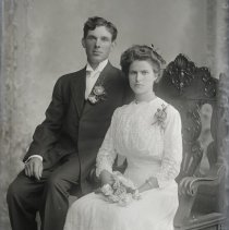 Glass plate negative of a wedding photograph of Fred Perschau & Ida Peterson, married April 11, 1911. The bride is wearing a lacy white dress with a pearl necklace. She has a flower in her hair and a corsage. She is holding a bouquet. The groom has a boutonniere. Both are seated on a large wooden chair. Taken in 1911 by Nelson Hassan, Photographer, Glencoe, MN. Negative #220. Fred Perschau was born December 14, 1886, son of Fred & Julia Tessmer...