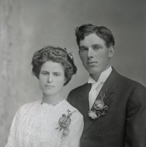 Glass plate negative of a wedding photograph of Fred Perschau & Ida Peterson, married April 11, 1911. The bride is wearing a lacy white dress with a pearl necklace. She has a flower in her hair and a corsage. The groom has a boutonniere. Taken in 1911 by Nelson Hassan, Photographer, Glencoe, MN. Negative #220. Fred Perschau was born December 14, 1886, son of Fred & Julia Tessmer Perschau. Ida Peterson was born October 10, 1889, daughter of Frit...