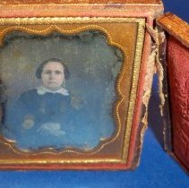 Photograph (ambrotype) of an unidentified woman. Inside a folding case with leather covering, hook closure, red velvet lining, gilt edging and copper matting under glass and around the photo.