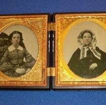 Two photographs (ambrotypes) of an unidentified young woman seated in a chair wearing a plaid dress in one view and wearing a coat and fancy bonnet in the other. The woman's cheeks have been tinted. The ambrotype is Inside an ornate, folding case of brown thermoplastic with a snap closure. Gilt copper matting is under the glass and around the two photos.