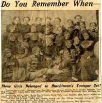 Scanned newspaper clipping "Do You Remember When--These Girls Belonged to Hutchinson's Younger Set?" Young women are pictured with names listed below the photo. Also a photocopy of same clipping. Identical to 1979-2220-001. (l to r) Front: Daisy Smith, visiting girl, Helen Oppenheimer, Effie Powell Clay. Row 2 (from front): Dolly Paul Hansen, visiting girl, May Phillips Newcomb, Carrie Parsons, Grace Hamilton Langfitt, Kate Kiesler Blanchar...