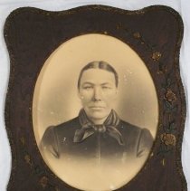 Large framed charcoal drawing of an unidentified woman. Found by the donors with other framed items in the upper story of 129 E. Main Street, Silver Lake, MN. Probably belonged to Anton J. & Catherine (Katrine) Domagalski who lived above the A. J. Domagalski Dry Goods and Grocery operated in the building at that address. The Church of St. Adalbert was located across the street. Wood frame with floral motif. The woman pictured is probably either ...