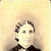 Sepia toned carte-de-viste card portrait photograph of Martha Harrington Merrill. She is wearing a light dress with white ruffle accent at the neck. Her hair is parted in the center. Photo is credited to Jacoby, Minneapolis, MN.