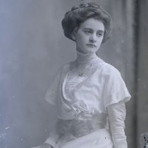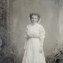 Glass plate negative of a photograph of a woman identified as Edna Tickhoff. She is wearing a white shirtwaist that has ruffles. Taken in 1911 by Nelson Hassan, Photographer, Glencoe, MN. Negative #497.