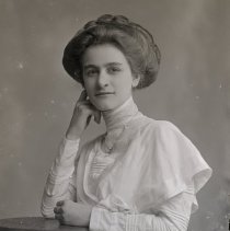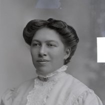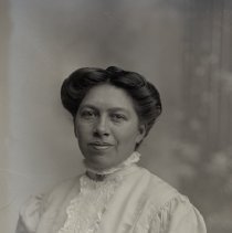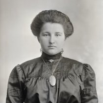 Glass plate negative of a photograph of a young woman identified as Annie Wroge. She is wearing a dark high neck dress with a large pendant necklace. Taken in 1911 by Nelson Hassan, Photographer, Glencoe, MN. Negative #40. Believed to be Annie Wroge, born November 1, 1889, daughter of Fred & Anna Hebeisen Wroge.