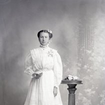Glass plate negative of a graduation photograph of a young woman identified as Frieda Spahr. She is wearing a white dress with a high neck and a cape effect around the shoulders. She has her right elbow and her left hand on a small round stand. Photo was taken in 1910 by Nelson Hassan, Photographer, Glencoe, MN. Negative #247. Frieda Spahr was born in December 1892, daughter of Clara Spahr. They lived at Glencoe, MN in 1910.