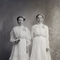 Glass plate negative of a confirmation photograph of two young women identified as cousins (l to r) Doris Sprengeler and Lydia Sprengeler. They are wearing white dresses with a high necks. Doris is holding a prayer book and both have flowers in their hair. Photo was taken in 1910 by Nelson Hassan, Photographer, Glencoe, MN for Henry Sprengeler. Negative #185. Doris was born March 19, 1896, daughter of Louis and Amelia Sprengeler. Doris marri...