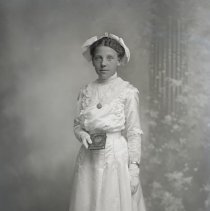 Glass plate negative of a confirmation photograph of a young woman identified as Doris Sprengeler. She is wearing a white dress with a high neck and ruffles. She is holding a prayer book and has flowers in her hair and on a small nearby stand. Photo was taken in 1910 by Nelson Hassan, Photographer, Glencoe, MN for Henry Sprengeler. Negative #185. Doris Sprengeler was a cousin to Lydia Sprengeler and niece of Henry Sprengeler. Doris was born Ma...