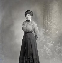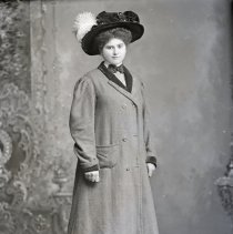 Glass plate negative of a photograph of a young woman identified as Anna Swendra. She is wearing a large dark hat with a white plume and a light colored long coat with dark collar & cuffs. Taken in 1910 by Nelson Hassan, Photographer, Glencoe, MN. Unnumbered negative. Annie Swendra was born June 29, 1894, daughter of Martin & Victoria Pelarski Swendra.
