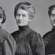 Glass plate negative of a photograph of five unidentified women made for Mrs. O. Vaughn. Taken in 1910 by Nelson Hassan, Photographer, Glencoe, MN. Negative #448. Photo was cropped to show only the women's heads and shirtwaists as they were standing in a row. Linnie Barnum married Orrin Orville Vaughn on 17 Jun 1903.
