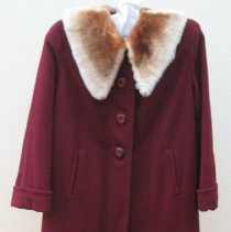 Winter coat of maroon wool with double collar of orange/blonde sheared mouton fur. Coat has four large front buttons, two slit pockets and lining. Sleeves have cuff. Belonged to Mathilda Ahlbrecht (Mrs. Richard Ahlbrecht) in the 1950s. A photo of her wearing the coat outside her daughter Pearl's garage near a high snowbank is 2021-0083-001. Mathilda Ahlbrecht was the mother of Pearl Ahlbrecht Baysinger (Mrs. Luallen) and grandmother of Linda B...